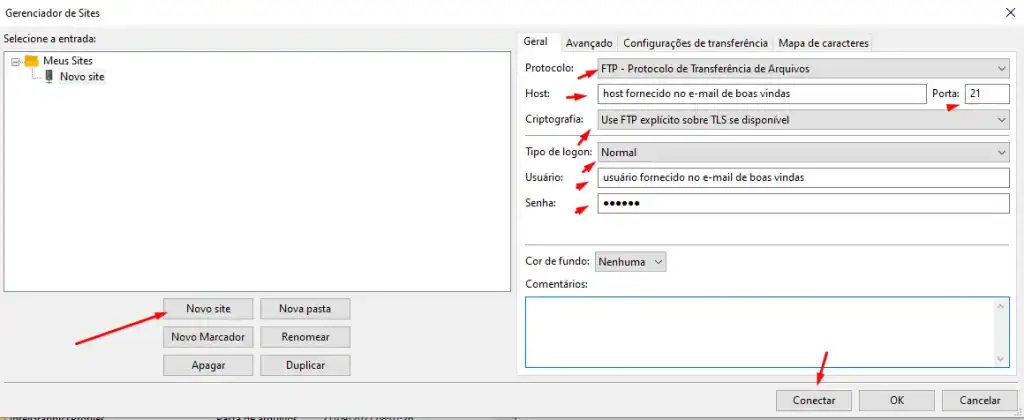 Clique então em Novo Site e preencha os campos de acordo com os dados fornecidos a você no e-mail de boas vindas conosco: